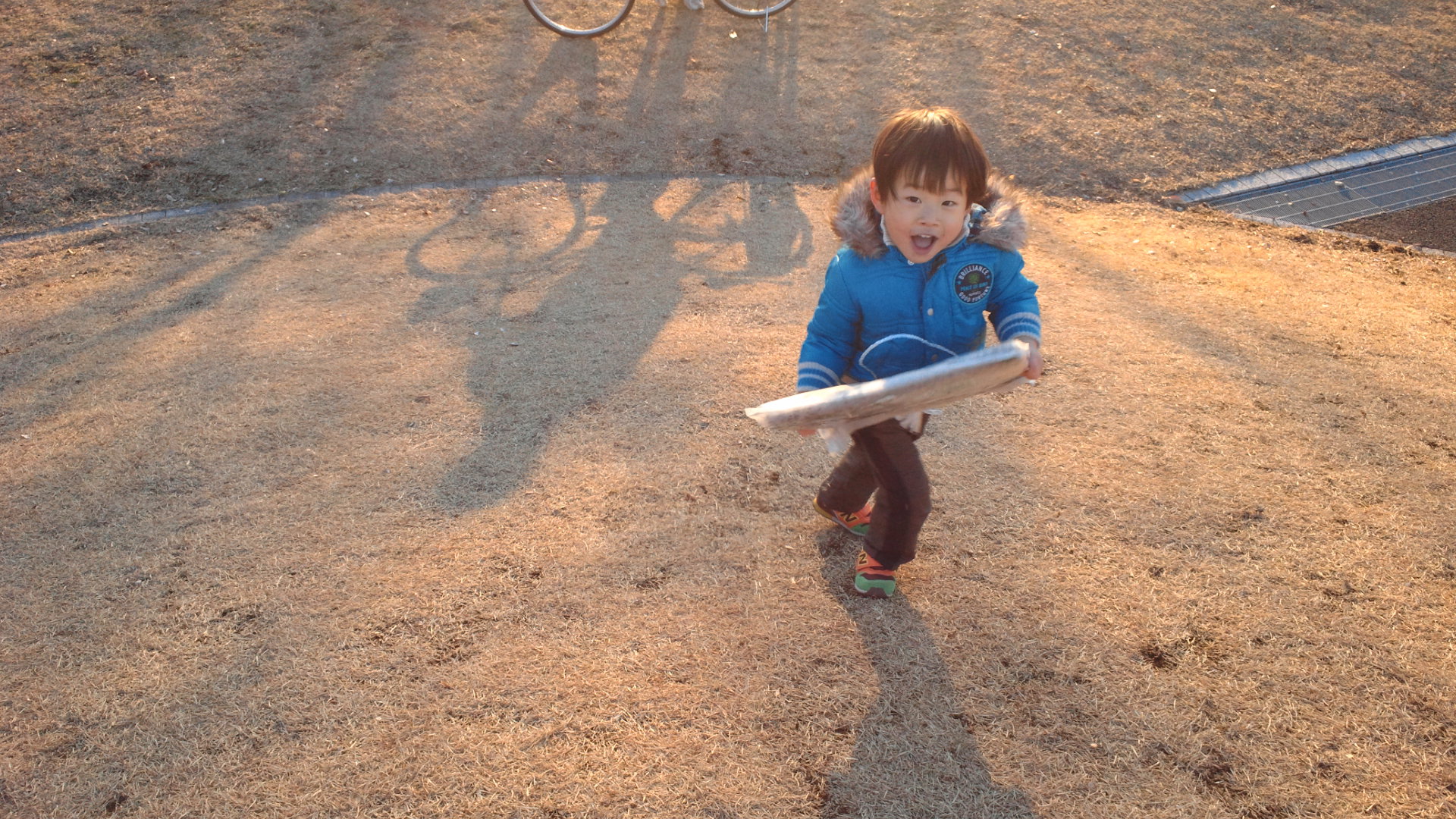 風もなく暖かったので、息子と斜面のある芝生で遊びました