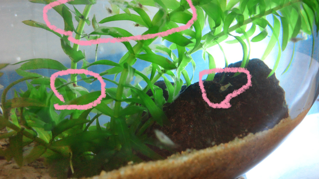 水槽の壁に張り付いている子が邪魔して起き上がれなかったようです(笑)